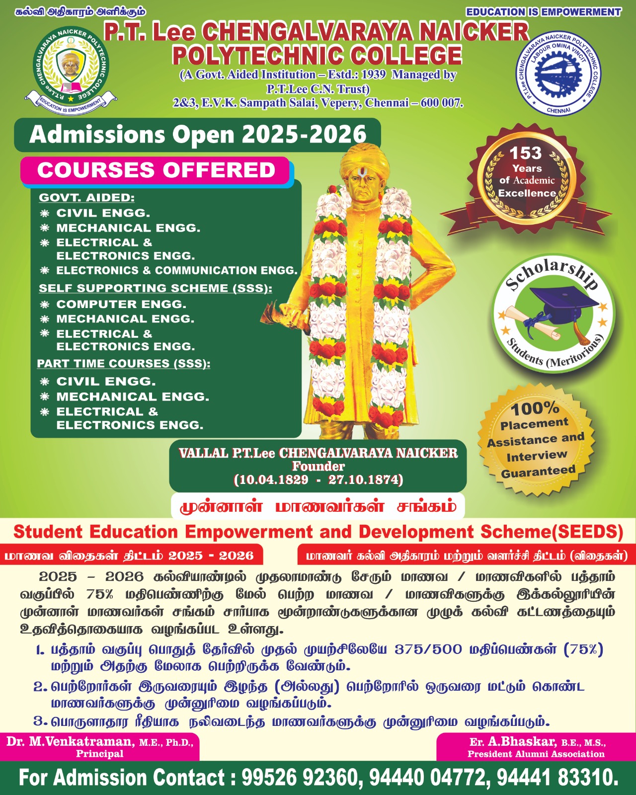 P.T.Lee Chengalvaraya Naicker Polytechnic College is a premier technical institution established with the noble vision of providing quality technical education to students from all sections of society. Founded in memory of the great philanthropist Shri. P. T. Lee Chengalvaraya Naicker (1829-1874), the college has been a beacon of technical education in the region for decades.